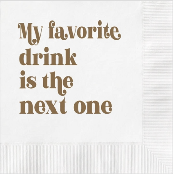 "My favorite drink is the next one!" humorous cocktail napkin will liven up your happy hour!Ā Featuring a retro text gold foil printed message that's sure to get a laugh and create conversation. Guaranteed to make every sip twice as fun. Cheers! š¹