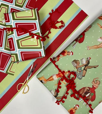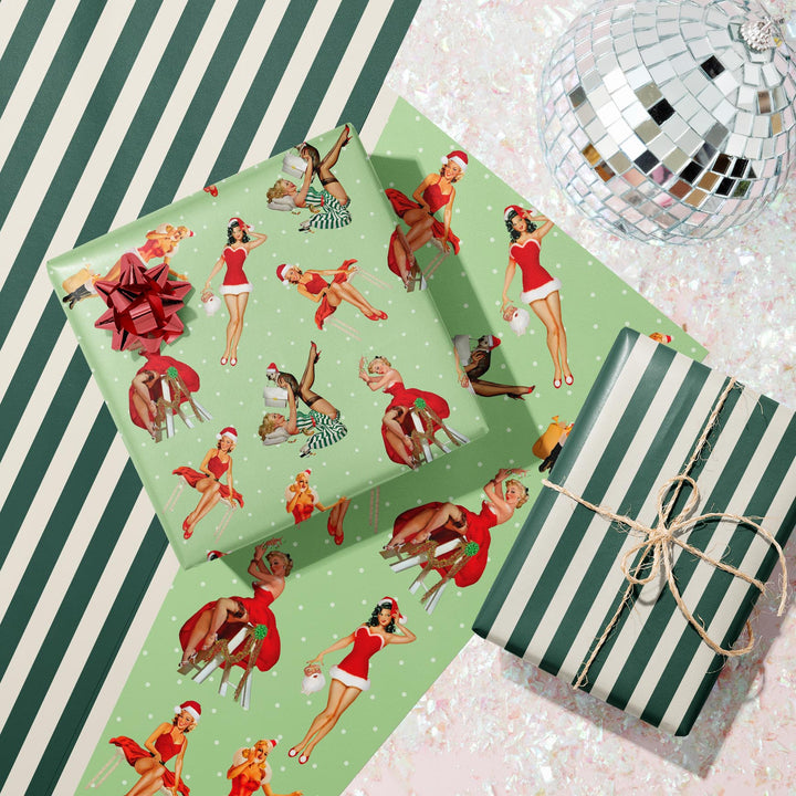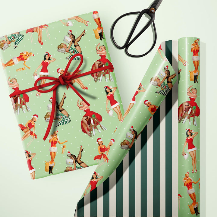 Bring retro glamour to every gift with our Double-Sided Vintage Pin-Up Wrapping Paper—a playful, nostalgic twist on holiday style. Featuring classic pin-up illustrations on one side and timeless stripes on the reverse, this premium wrap is designed to turn every present into a show-stopper.