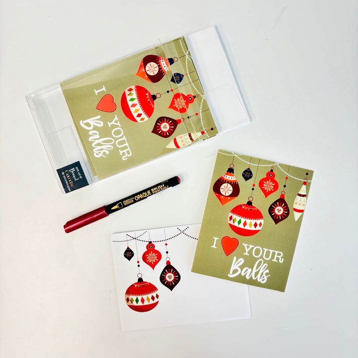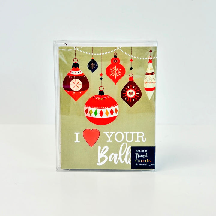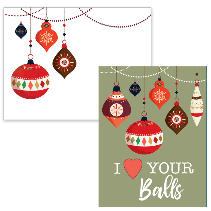 Show your funny side with the hilarious I Heart Your Balls Holiday greeting Cards! 🤗These cards feature a nostalgic vintage ornament design with a cheeky "I heart your balls!" message -- perfect for filling their holidays with laughter. With 8 mid century modern inspired cards and printed envelopes in each boxed set, you'll have plenty of chances to spread festive cheer! Blank Inside.