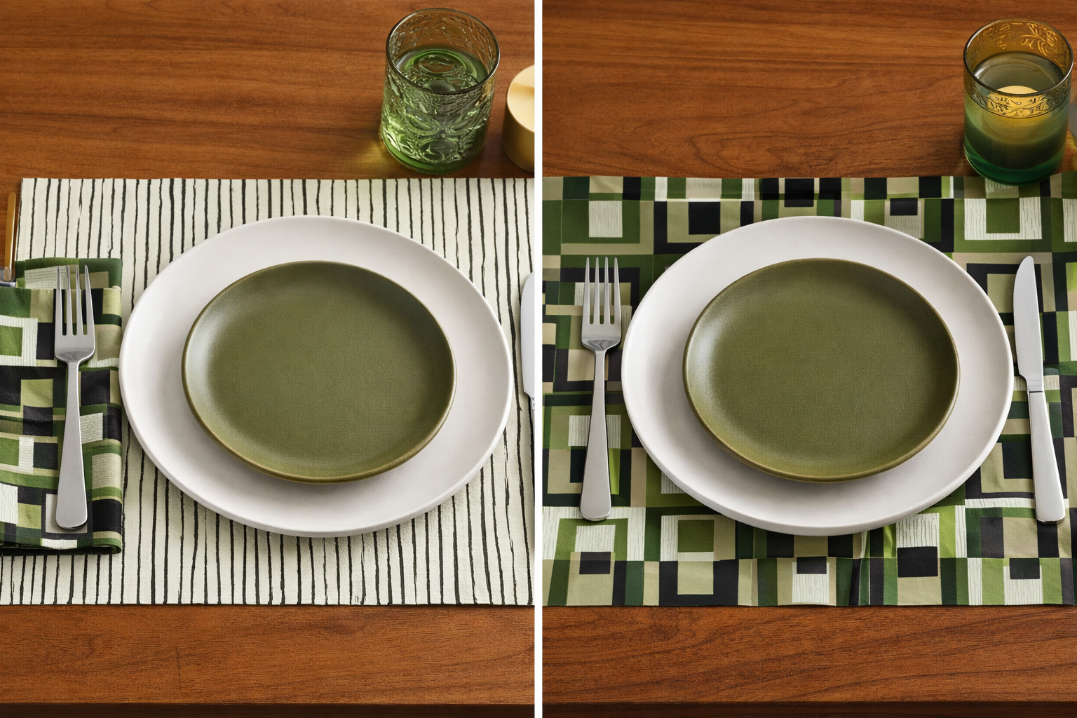 One side features an organic vertical stripe, while the reverse showcases a geometric square motif in layered greens, black, and warm neutrals. Thoughtful, graphic, and endlessly versatile, these placemats make entertaining easy—and stylish.
