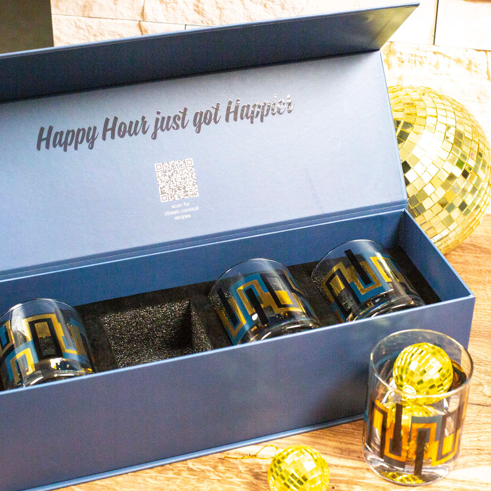 Cocktail Hour Set of 4 Blue and Gold Vintage Whiskey Glasses