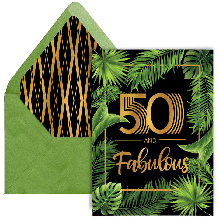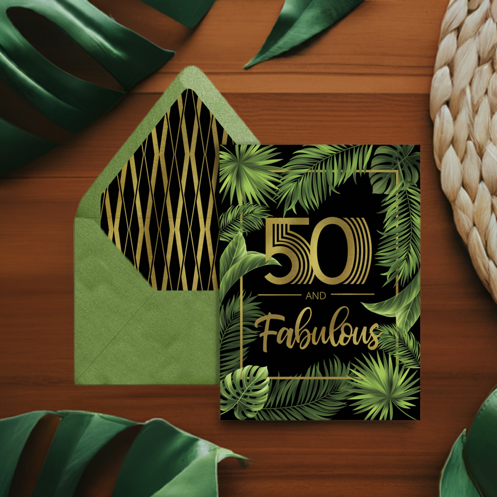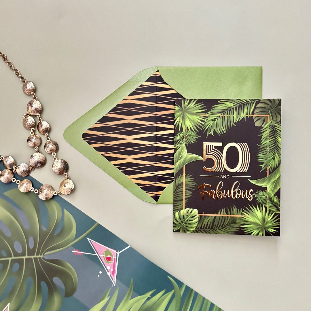 Celebrate a 50th birthday milestone in tropical style with this mid-century modern, Palm Springs-themed birthday card. Adorned with fabulous raised gold foil text reading "50 and Fabulous", this high quality luxurious matte card with a surprise coordinating liner upon opening is sure to make anybody feel special.