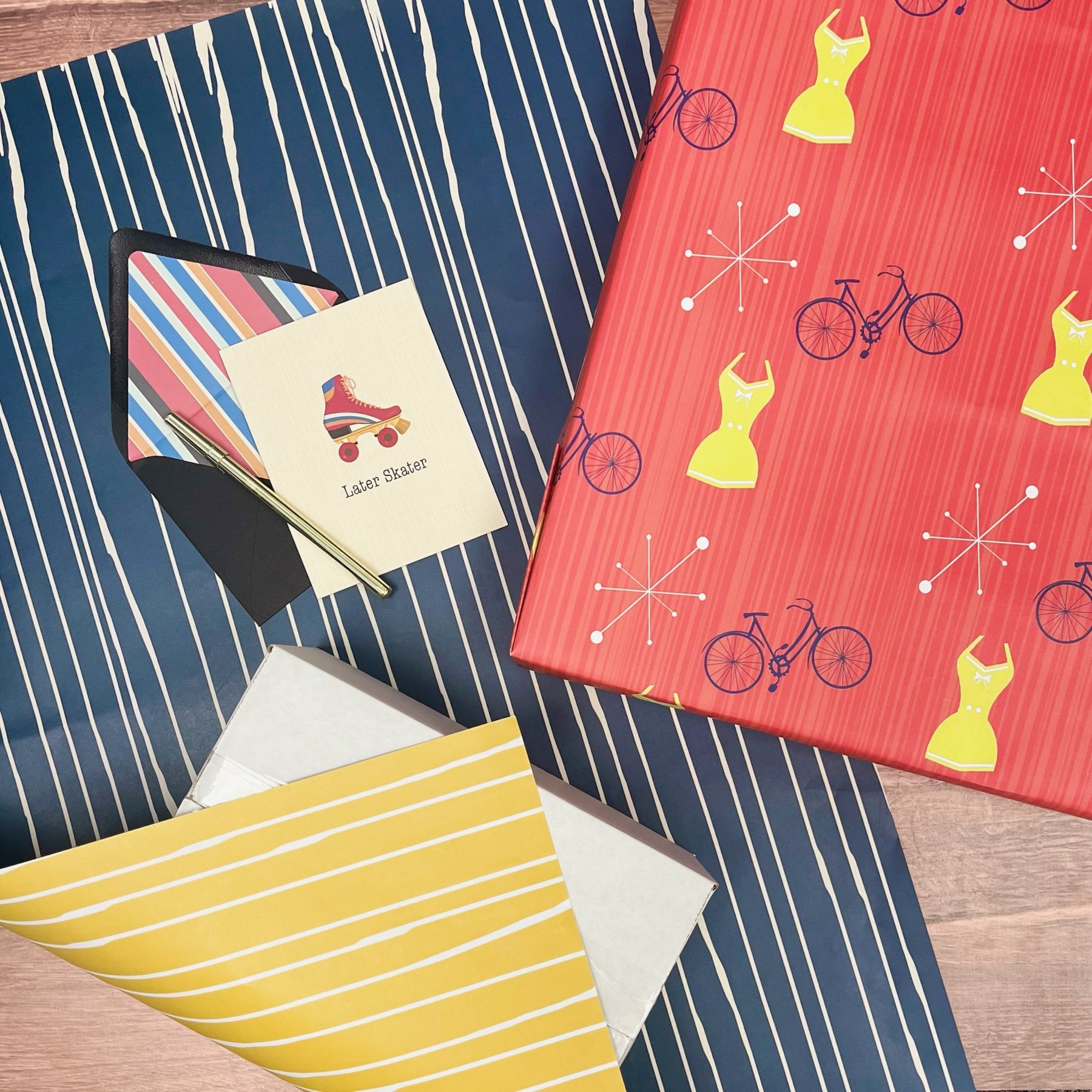 Wrap your gifts in style with our Worn Stripe Blue and Green Double Sided Gift Wrap! This premium quality paper features a mid century modern inspired textural design in both blue and green, perfect for any occasion or DIY craft project. The luxe finish adds a touch of elegance to for any gift giving event.