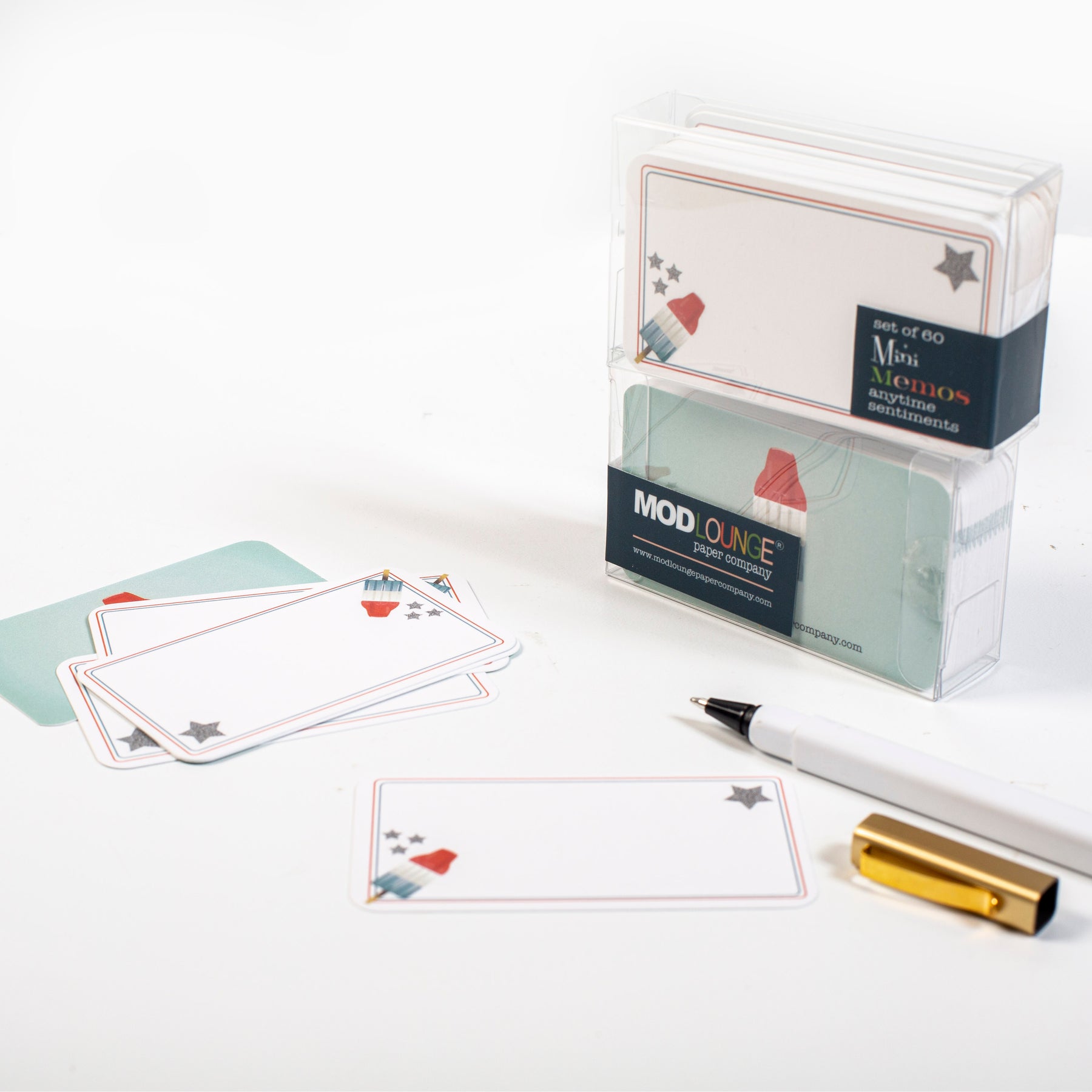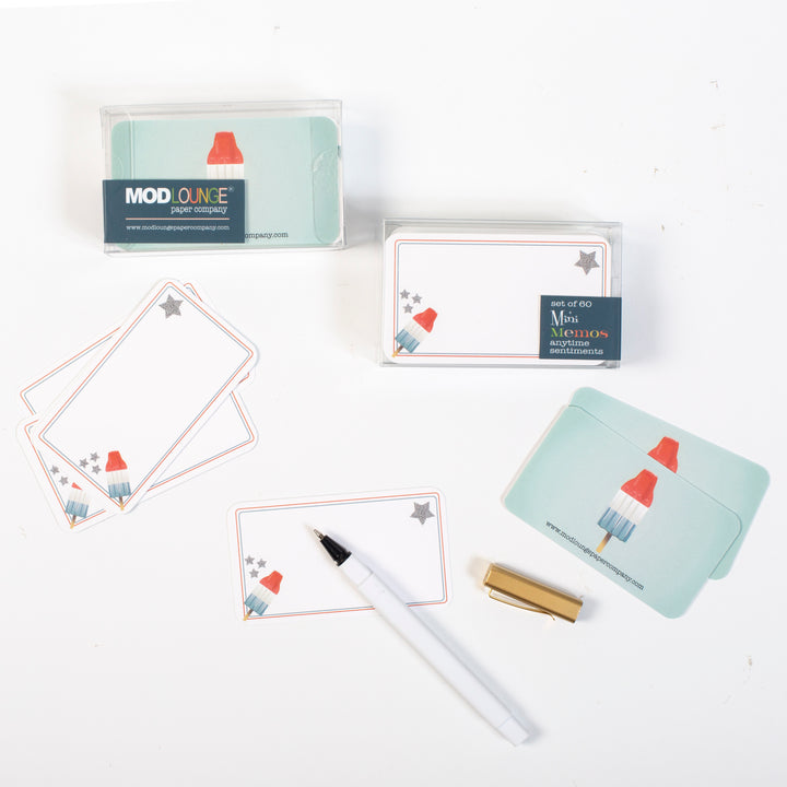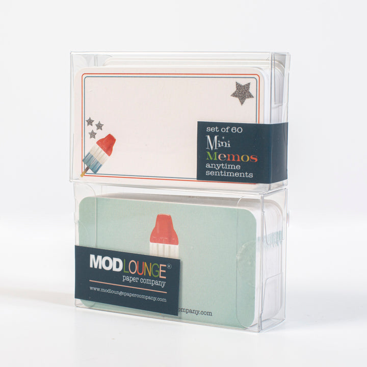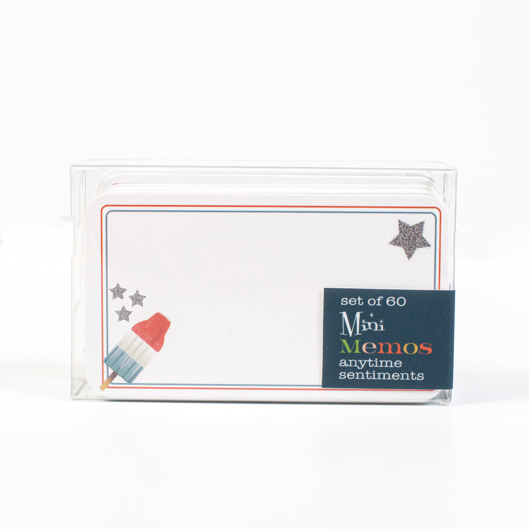 Add a nostalgic touch to everyday notes with Bomb Pop Mini Memo Little Lunch Notes! With 60 mini cards in each box, these anytime sentiments have so many uses. Send a little lunch note in your child's lunchbox, slip a sassy message in your mates laptop, wish a co-worker a birthday note on their desk, use at parties as food tags on a buffet table, or name tags at a dinner party. You will find that once you start using them, you'll become addicted to writing daily sentiments!