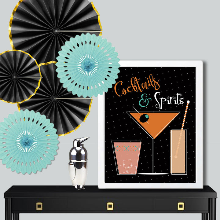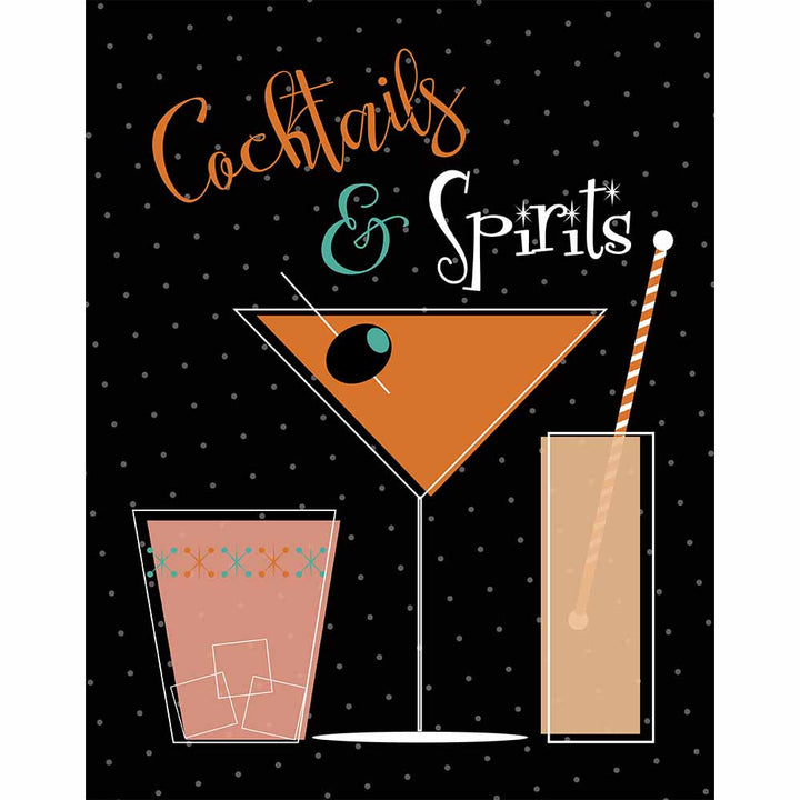 Festive Cocktails & Spirits print with mid century modern design and colors. Perfect for a Halloween party bar.