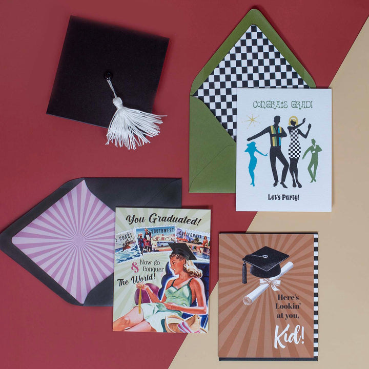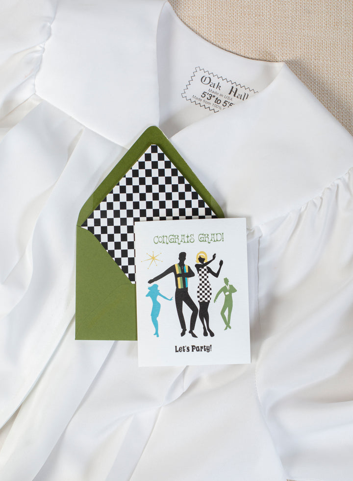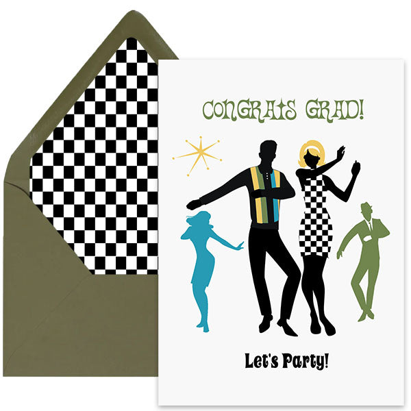 Surprise your favorite grad with this vibrant, mid-century modern card to celebrate their achievement! These stylish, dance-ready figures are sure to put a smile on their face - so congrats and cheers to the graduate!