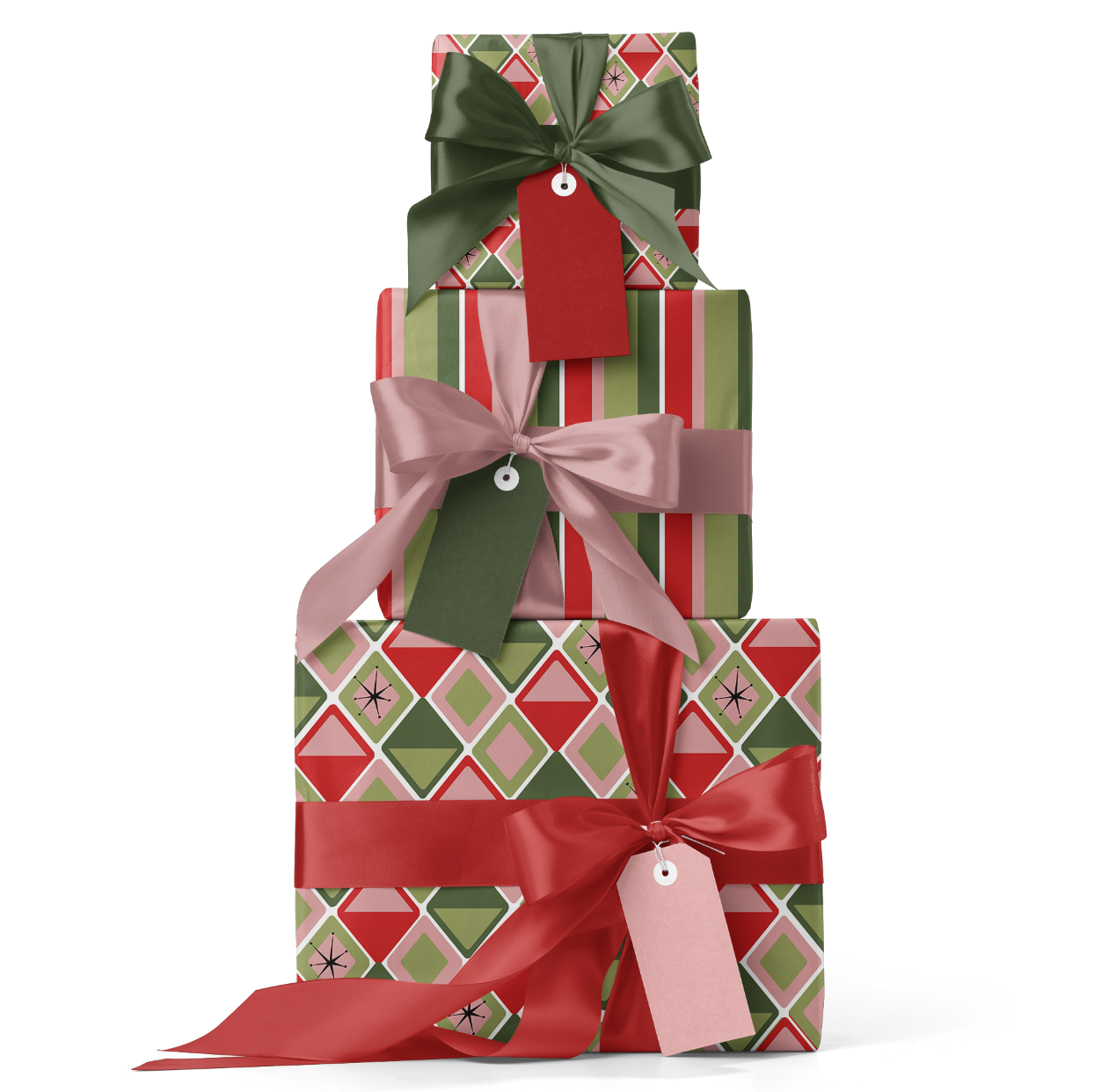 Surprise and delight your retro lovin' recipient with our luxurious and unique double sided Diamonds Mid Century Modern Gift Wrap. One side boasts a vibrant diamond pattern and bold mid-century modern starburst design and the other has a coordinating stripe to create a truly unforgettable gift duo. Capture the excitement of your occasion with this stunning and sophisticated wrap.