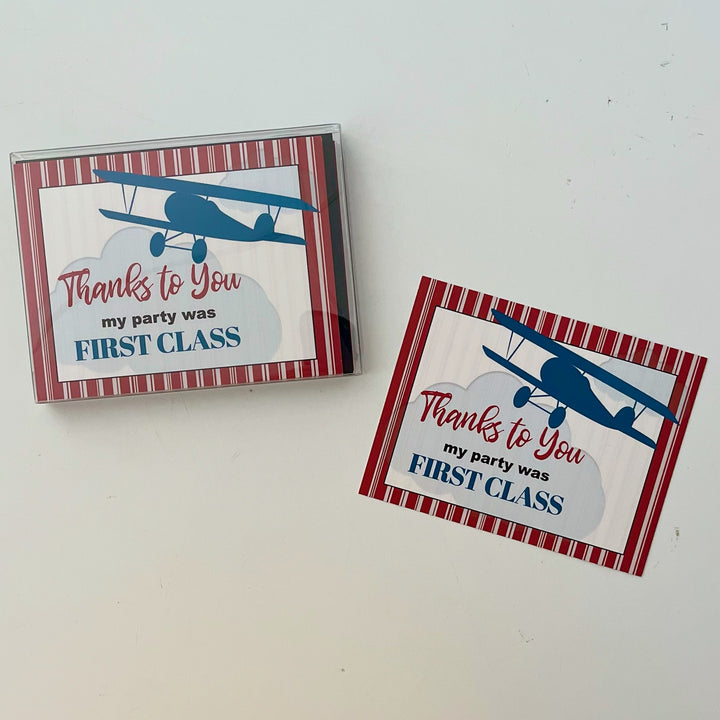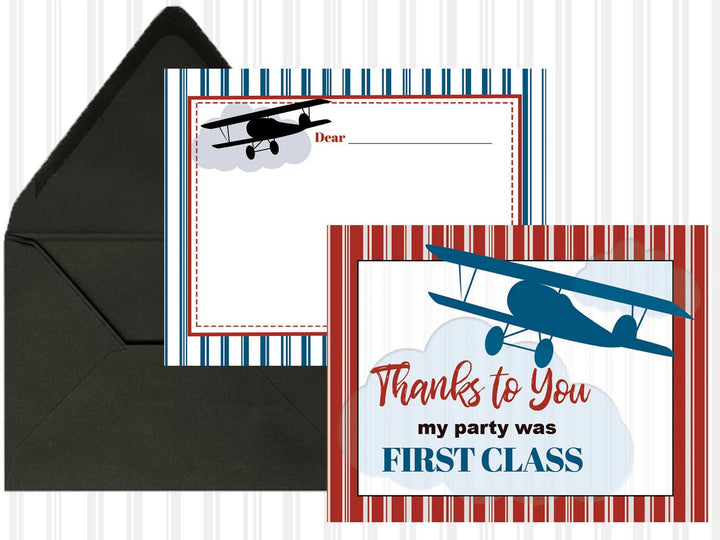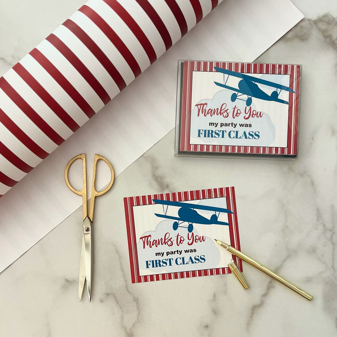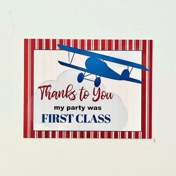 Thank your guests for making your child's party a first-class experience with our Vintage Plane Birthday Thank You Card. With a charming vintage plane theme and clever text, this card is sure to stand out. The classic red, white, and blue color palette and front and back design make it the perfect way to express your gratitude in nostalgic fashion.