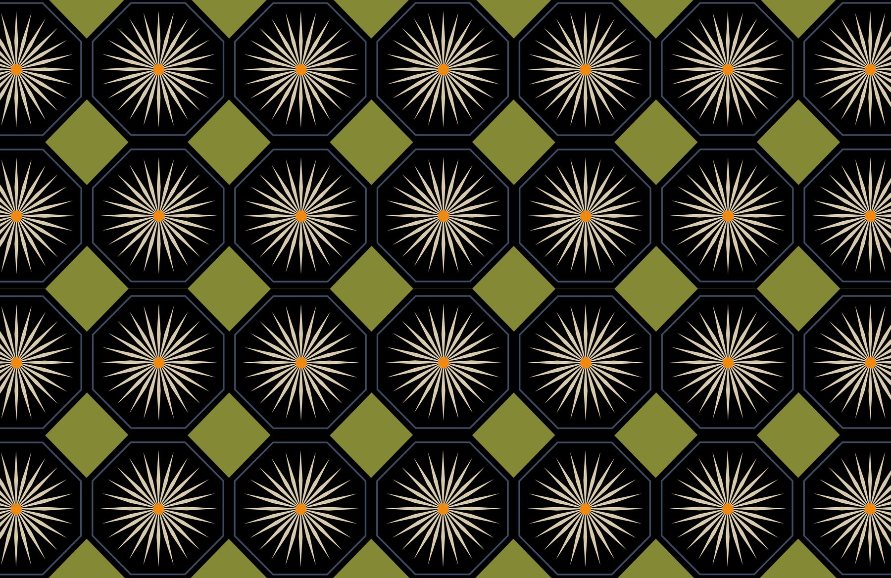 Photo-ready palette: mid-century olive, black, cream, and warm orange tones