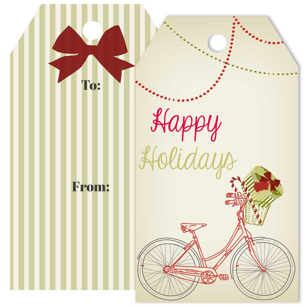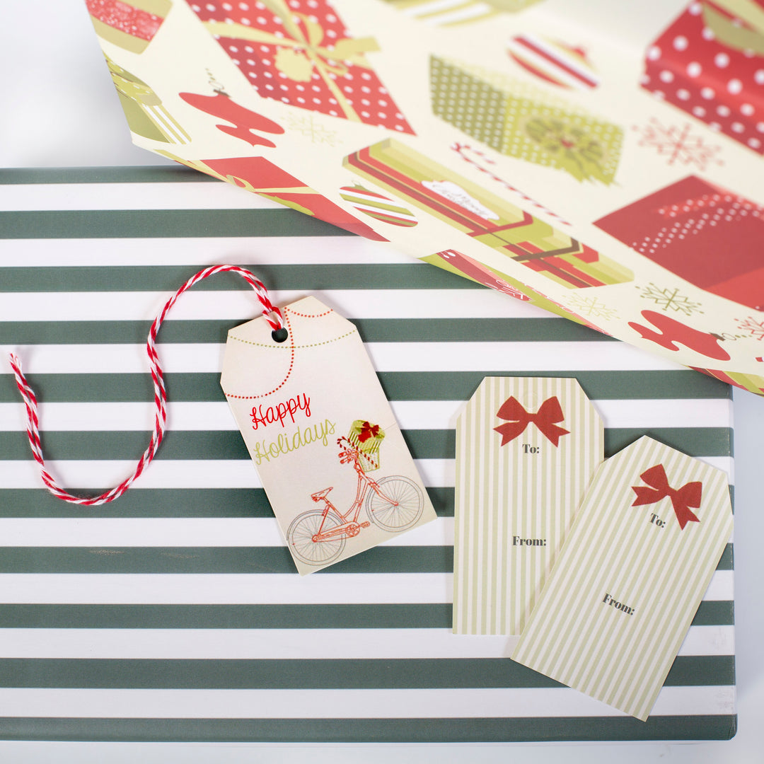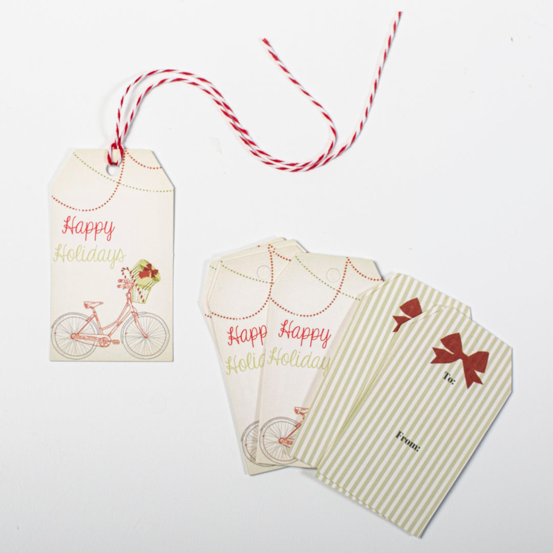 Add a touch of vintage charm to your holiday gifts this year. Each set includes 10 beautifully illustrated vintage holiday bike tags and includes rolled twine for easy attachment. The front reads "Happy Holidays" and the back features space for "To" and "From" names under a festive bow.
