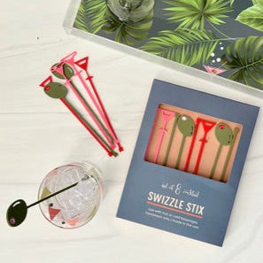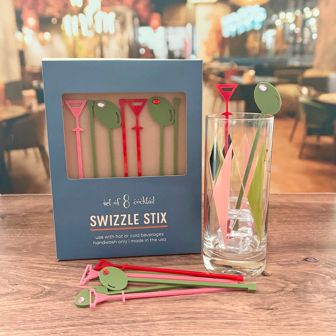 Elevate your sipping experience with these fancy Martini & Olive Swizzle Stix! With a striking pink and red martini, and matte green olives garnished with rhinestones, these drink stirrers will have you sipping in style. Who says a martini can't have a little glam?