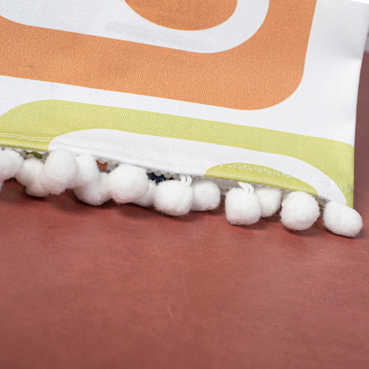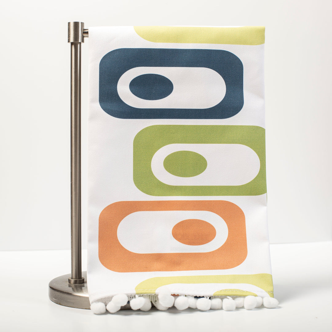 Bring a touch of mid century modern elegance into your kitchen or bar with this nostalgic Circle in Squares tea towel. Crafted from pure cotton with a white chenille pom trim, this tea towel will add a sleek geometric statement to any home. Upgrade your home or office with this timeless piece of mid century modern style!