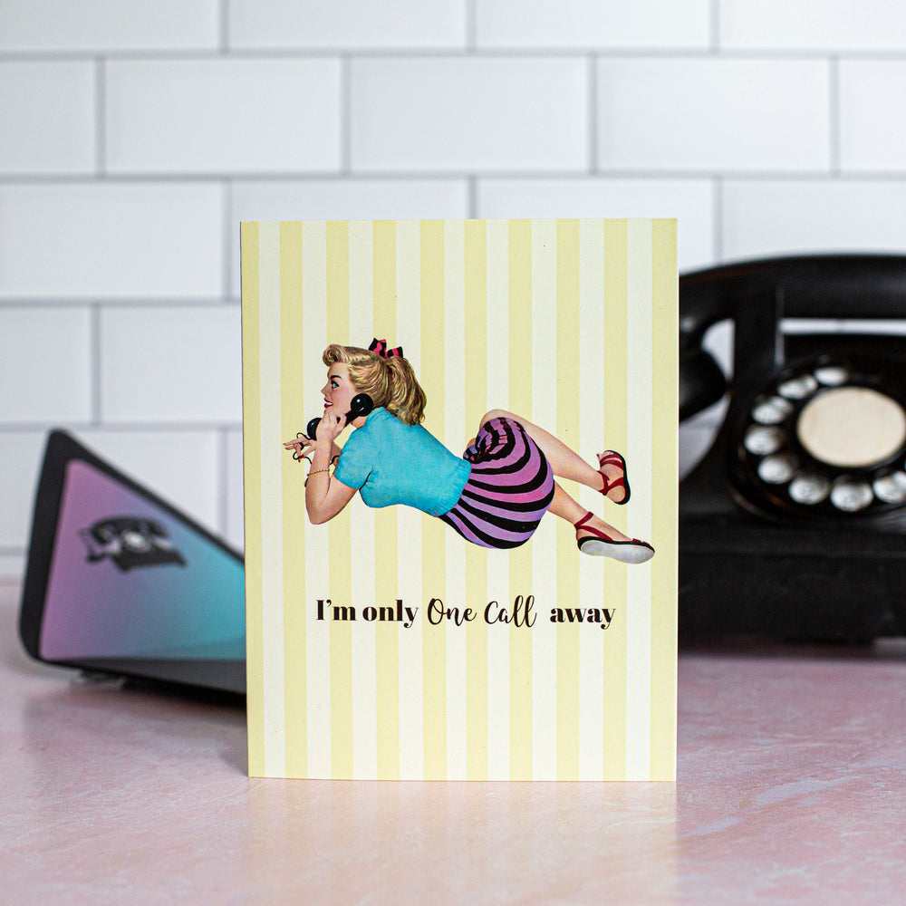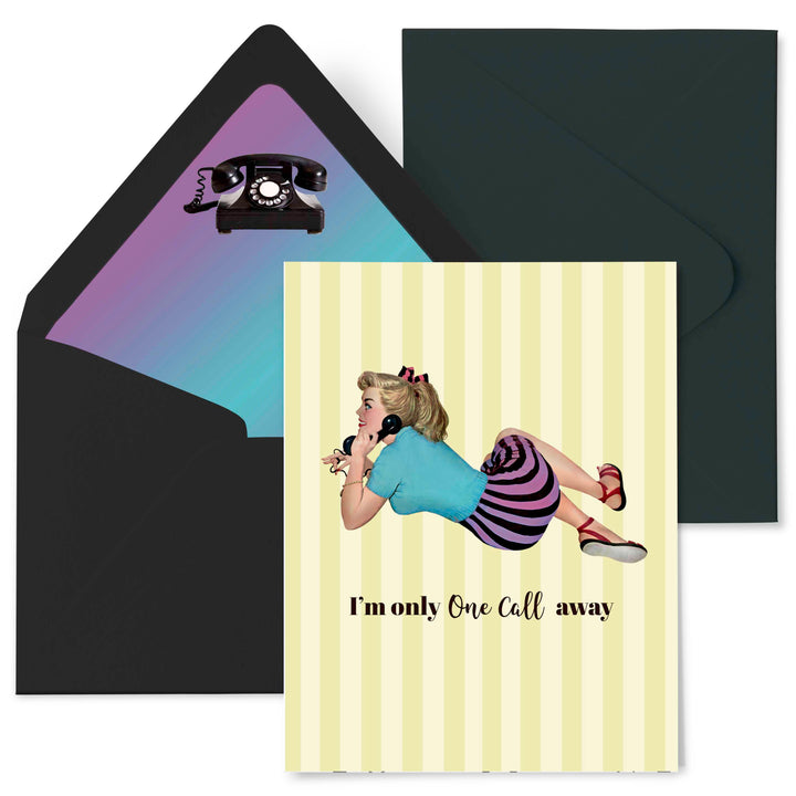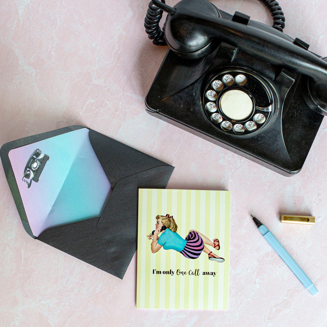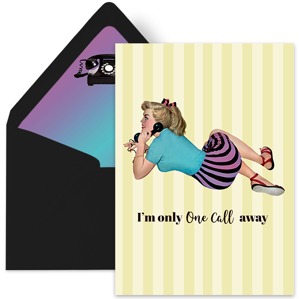 Bring a touch of vintage charm to your message with our One Call Away Thinking of You Card. Featuring a sunny yellow color palette and a vintage teenage pinup illustration, this card exudes warmth and nostalgia. A friendly reminder that you're always there, just a call away. Plus the envelope liner with retro phone image will be an added bit of excitement upon opening!