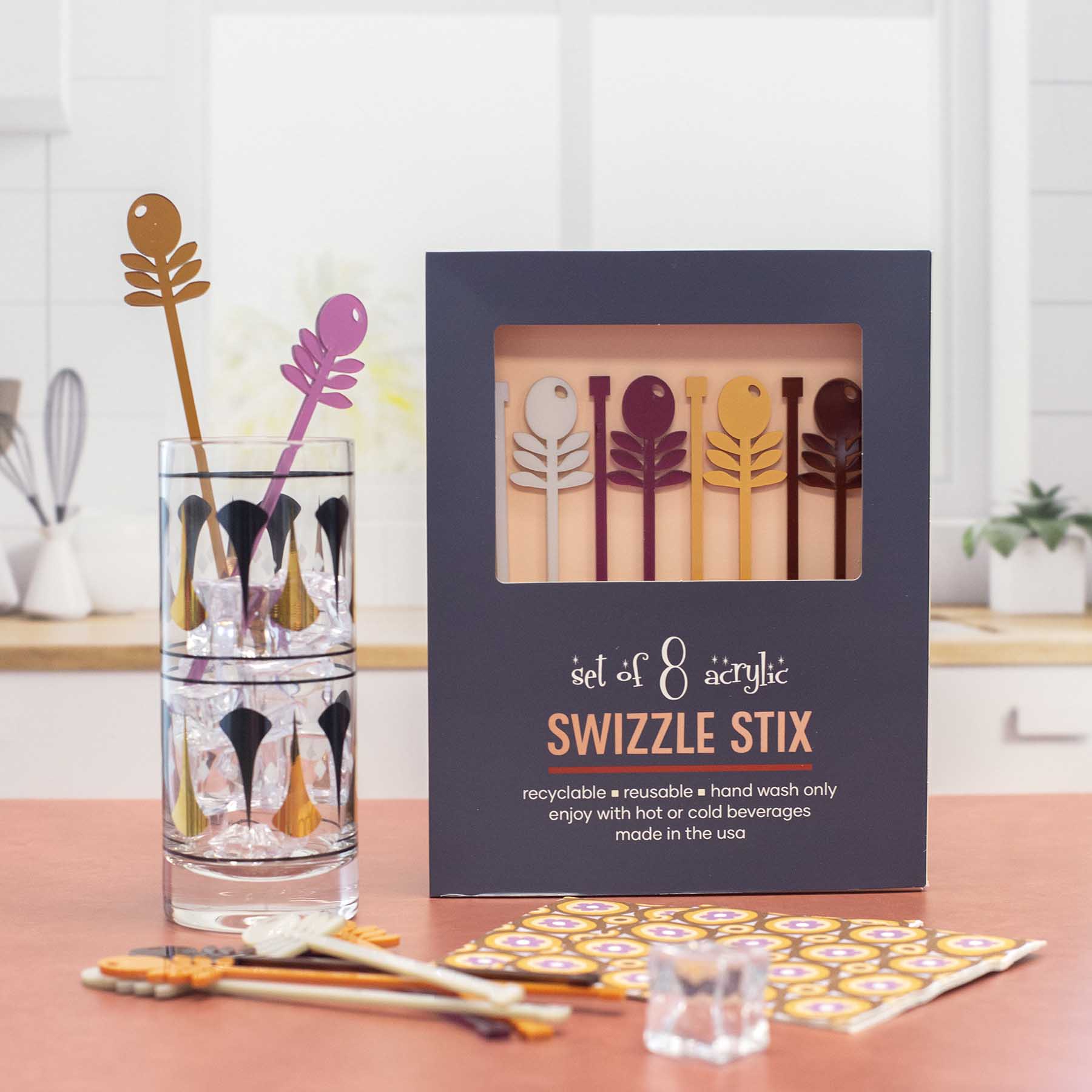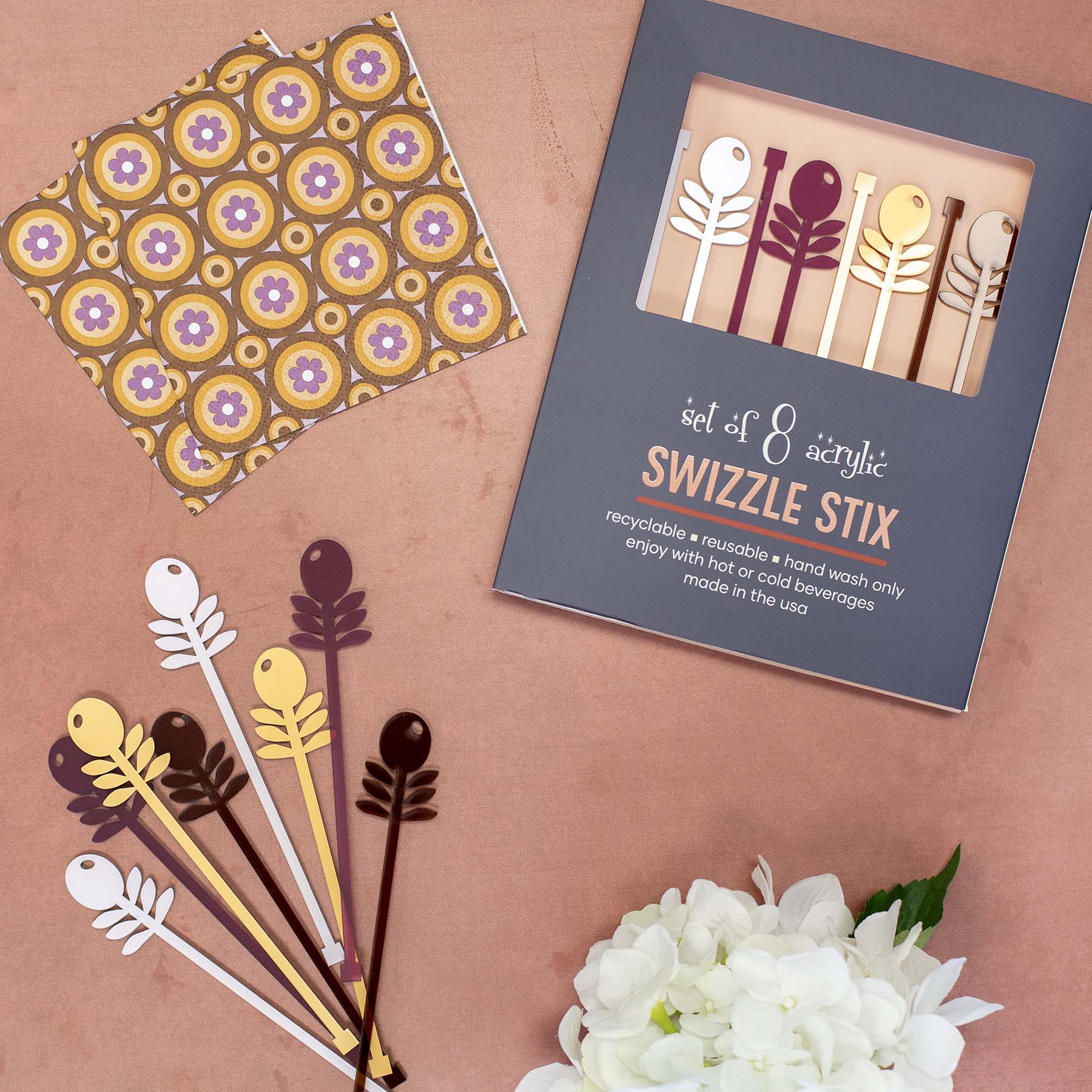 Bring the mid century modern vibe to your cocktail experience! Our Purple Flowers Beverage Mixing Swizzle Stix feature an elegant pink palette with delicately detailed mid century modern flower designs. These swizzle sticks are perfect for stirring and twirling cocktails with a sophisticated touch. Set of 8 perfectly packaged for gift giving, housewarming and hostess gifts!