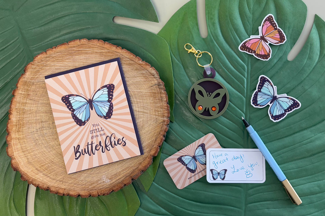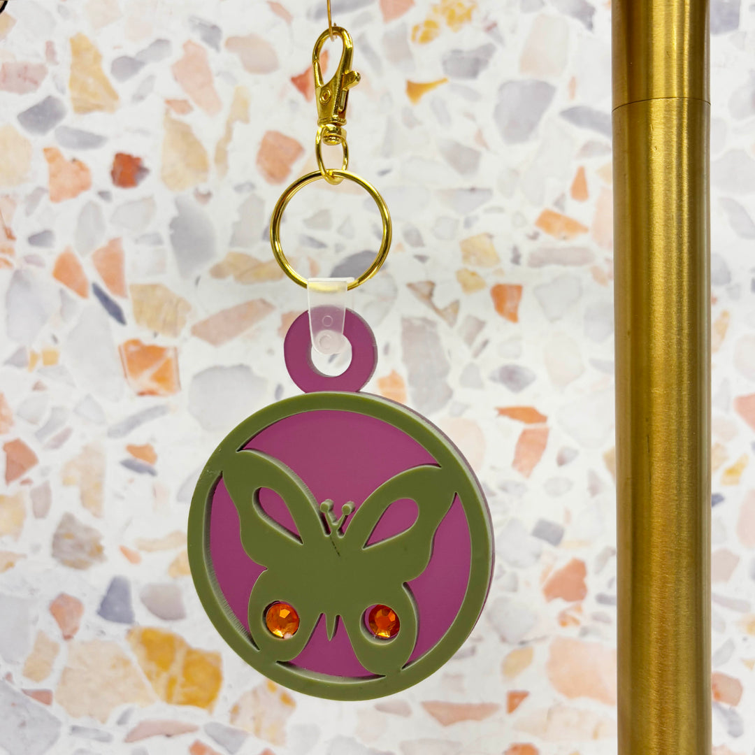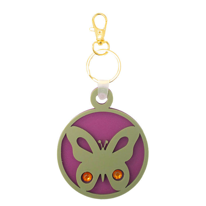 Fly back in time with this premium butterfly-shaped keychain! Made with high-quality olive green and frosted plum acrylic and adorned with sparkling rhinestones, this retro keychain is sure to add some glamour to your everyday carry. Plus, the lobster claw attachment makes it easy to clip onto your bag or keys. Perfect for butterfly lovers, 16th birthday new drivers, new home owners, "you give me butterflies" cute gift idea or anyone looking to add some personality to their belongings.