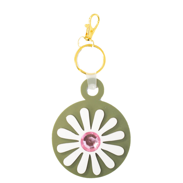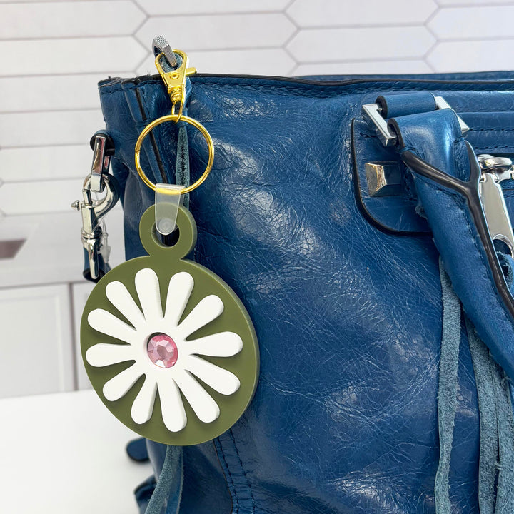 Add a touch of vintage charm to your keychain collection with our Retro Flower keychain! Featuring a groovy white flower on a seventies inspired olive green acrylic back, and adorned with a sparkling pink rhinestone, this keychain is perfect for a sweet 16 celebration, new home owner or birthday gift. Lobster claw grip to easily embellish a pocket loop or purse. Express your unique style with this must-have accessory!