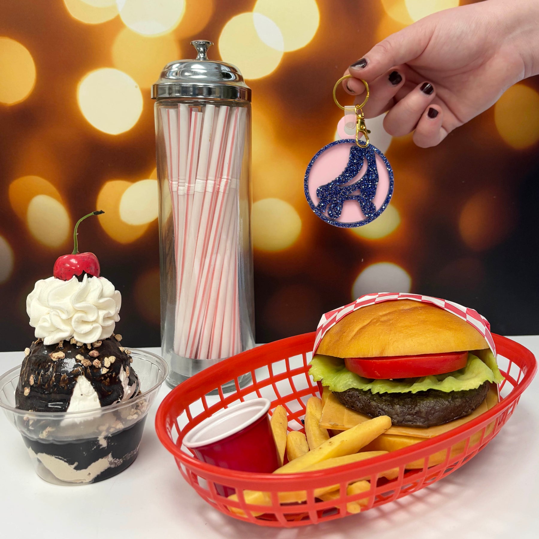 Retro Roller Skate Acrylic Round Blue Glitter Keychain