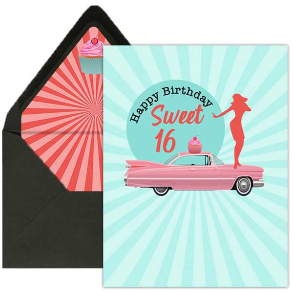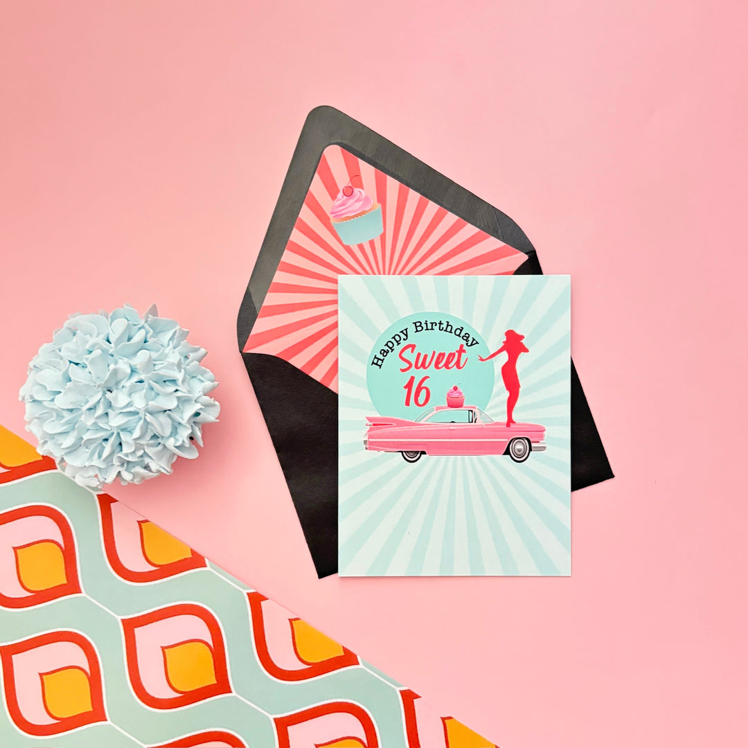Get ready to groove with the Mod Dancer Sweet 16 Birthday Greeting card! Featuring a retro design and a classic car, pink cupcake and gogo dancer illustration, this card is perfect for the new driver in your life. Let's rev up the celebration! Coordinating envelope and liner makes it a keepsake card!