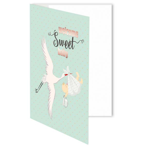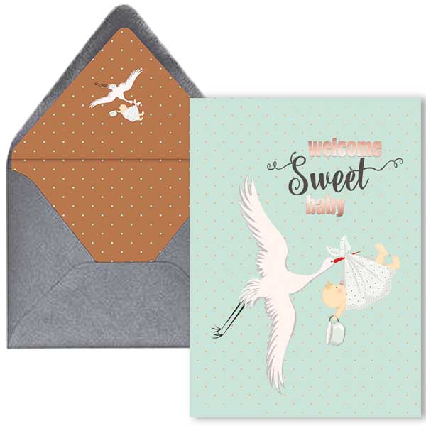 Welcome new bundles of joy with this vintage stork Welcome Sweet Baby Shower Card! Showcase your heartfelt sentiments with the nostalgic design and envelope liner for a touch of elegance and keepsake memories. Perfect for delivering celebrations of joy! Non-gender specific.