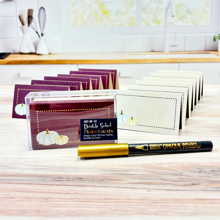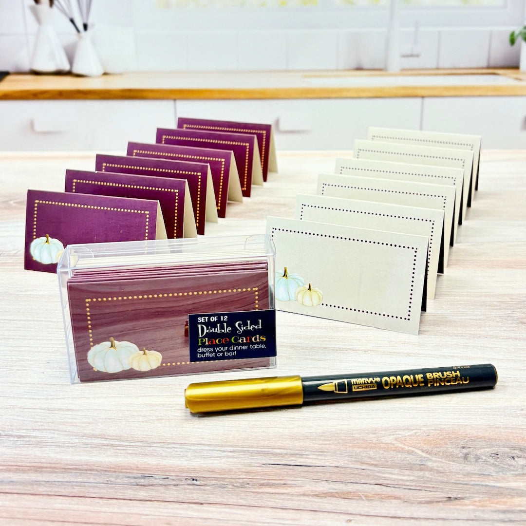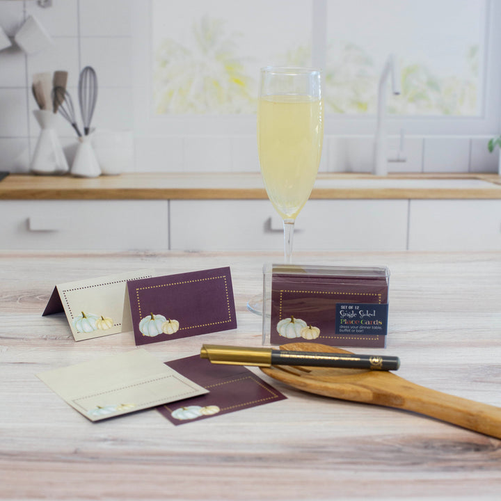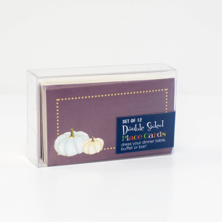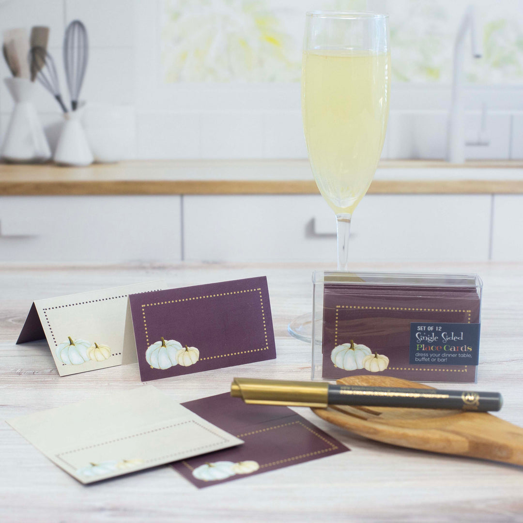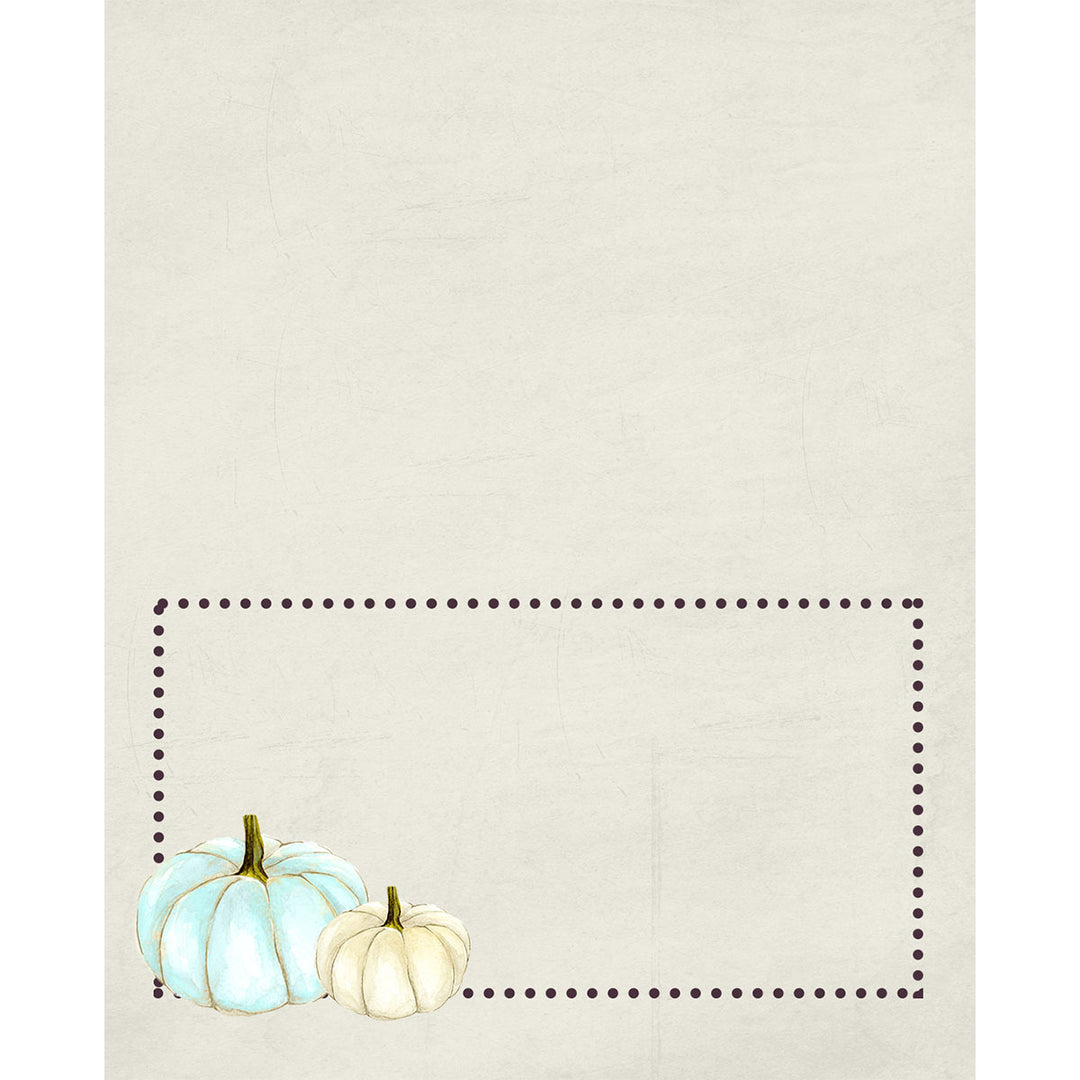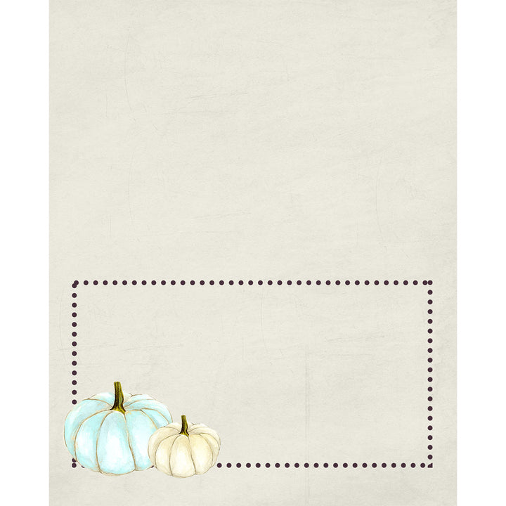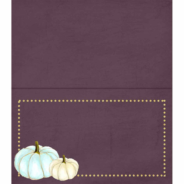 Enhance your Thanksgiving or Fall gathering with these 12 elegant white pumpkin-themed place cards. The lavender texture background and golden dot border one one side, add a touch of modern sophistication while the classic creme color way gives a vintage touch for multi use. Use them for name cards at a dinner party or food tags at a holiday buffet to add a unique and stylish touch.