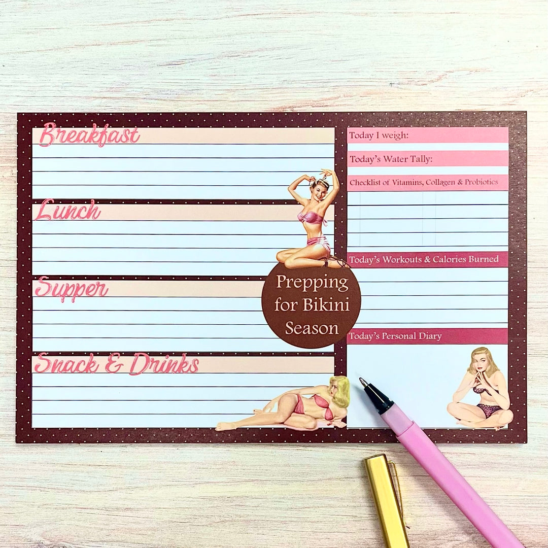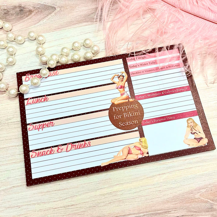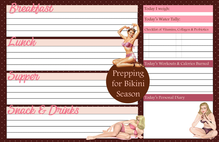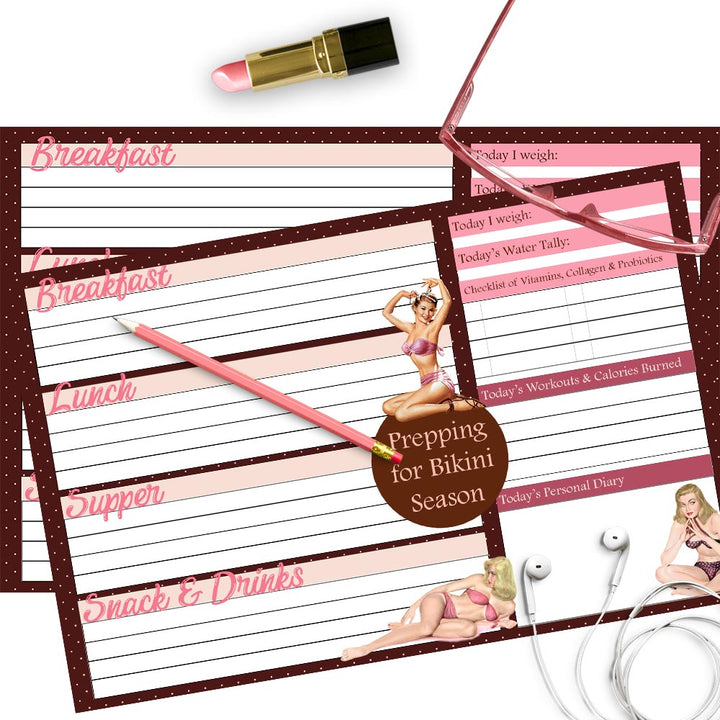 Immerse yourself in the world of vintage pinup with our Pinup Workout Wellness Diet Journal Notepad. This fun and motivational journal allows you to log your meals and track your daily health habits. Keep yourself accountable and inspired on your wellness journey.